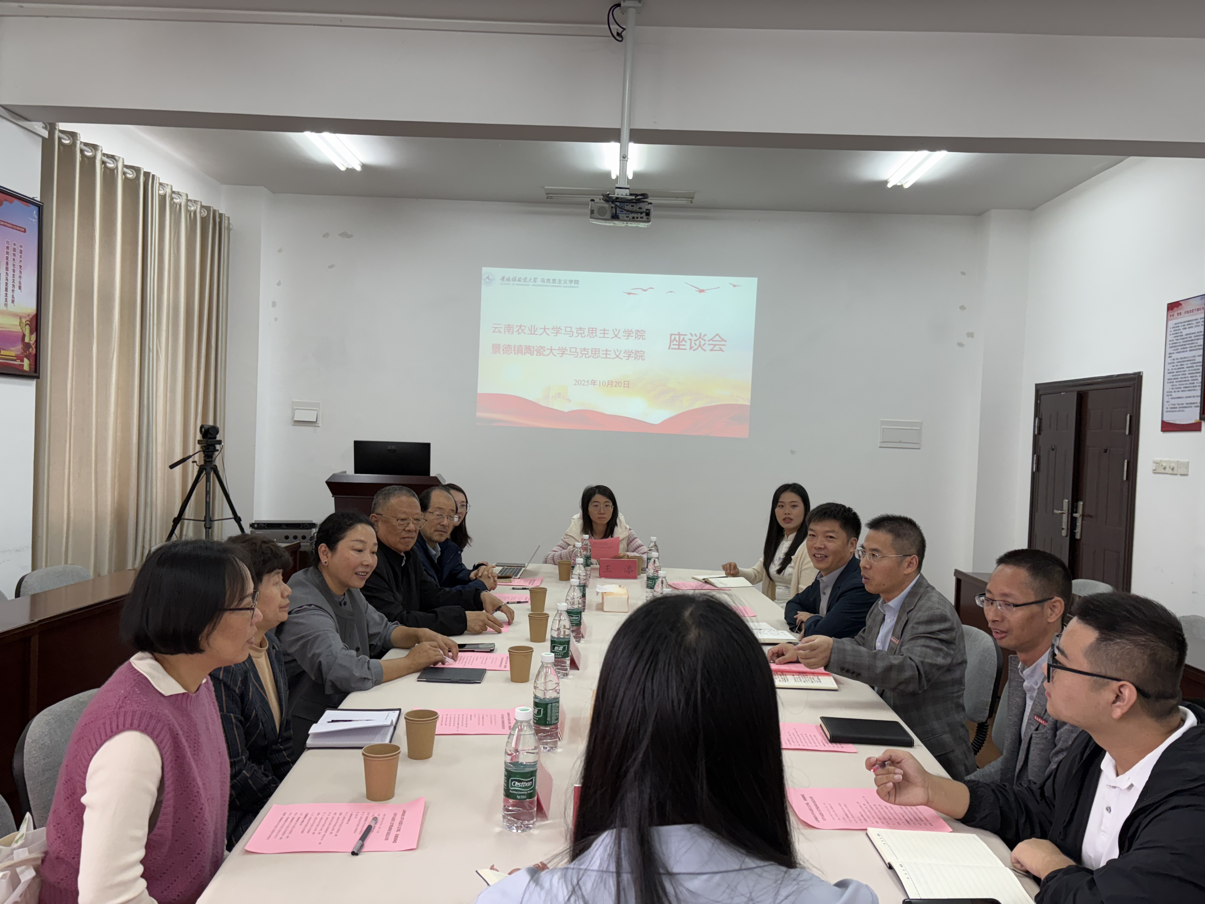 本网讯(文/张玉婷图/吕文郡)10月22日,云南农业大学马克思主义学院院长杨玲一行来我院调研交流,景德镇陶瓷大学马克思主义学院院长王文华热情接待了杨玲一行,并召开座谈会。会议由院长王文华主持,学院教师代表参加座谈会。